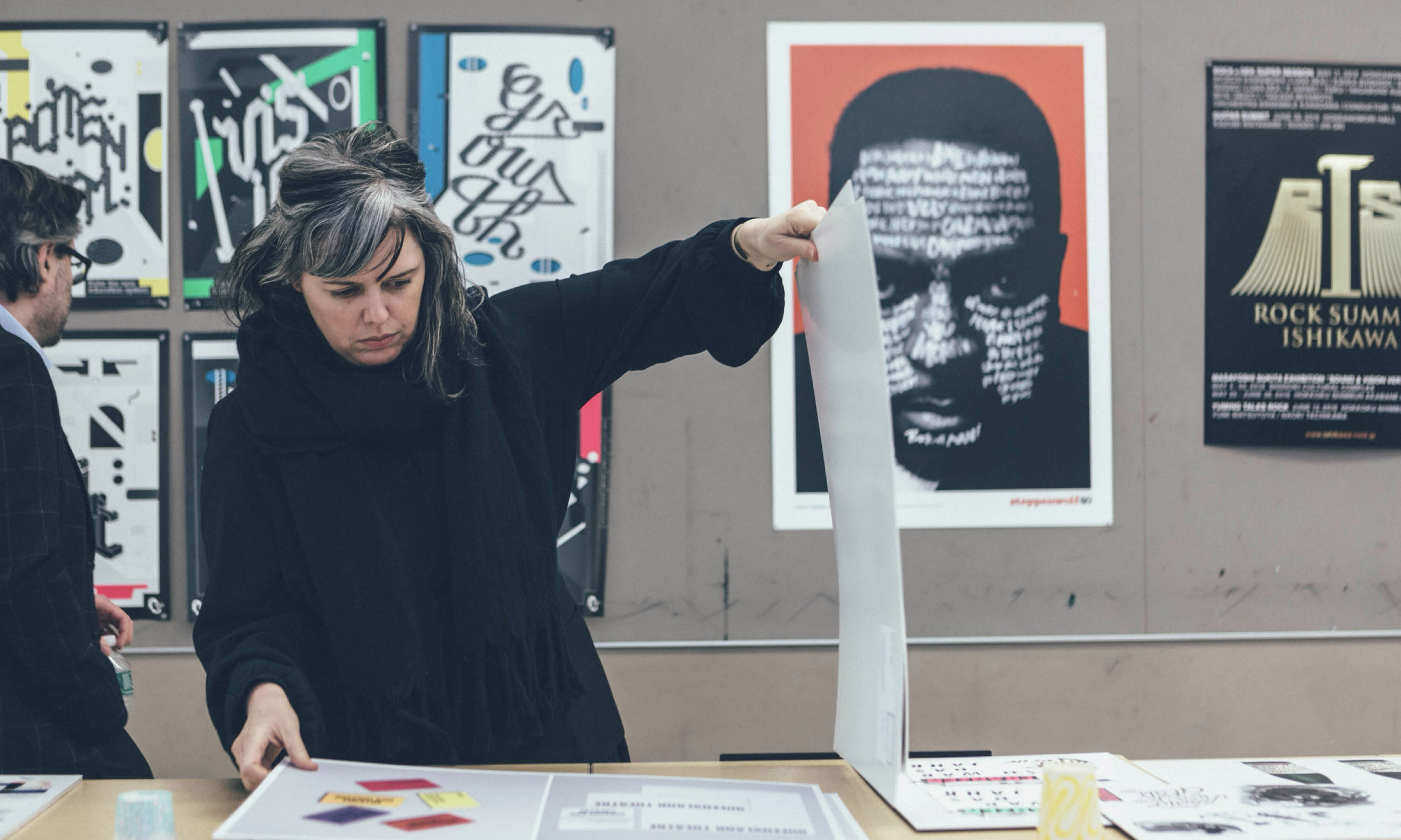 Judges Ben Schott and Deb Wood review Communication Design work during the TDC68 competition.